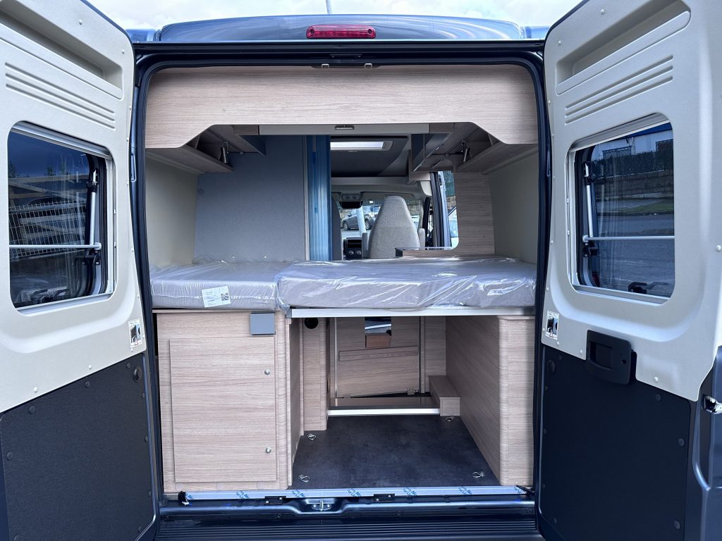 Por último, la cama transversal trasera está diseñada para alojar cómodamente a dos personas, asegurando un descanso reparador después de un día lleno de aventuras.