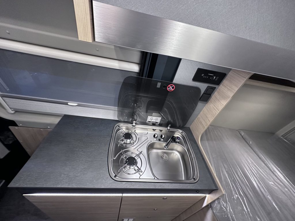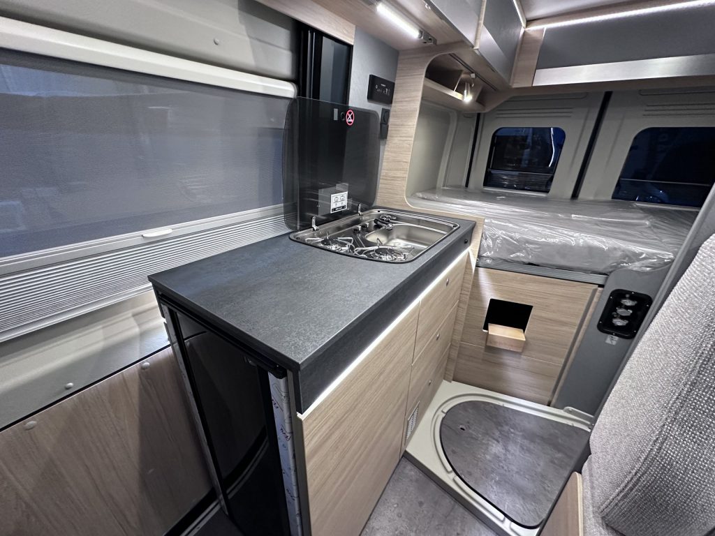 Además, la cocina está equipada con dos fuegos y un fregadero ubicado en el mismo hueco, lo que optimiza el espacio disponible. La encimera corrida ofrece un amplio espacio de trabajo, facilitando la preparación de tus platos favoritos. Por si fuera poco, el frigorífico cuenta con una doble apertura, permitiendo el acceso tanto desde el interior como desde el exterior del vehículo.